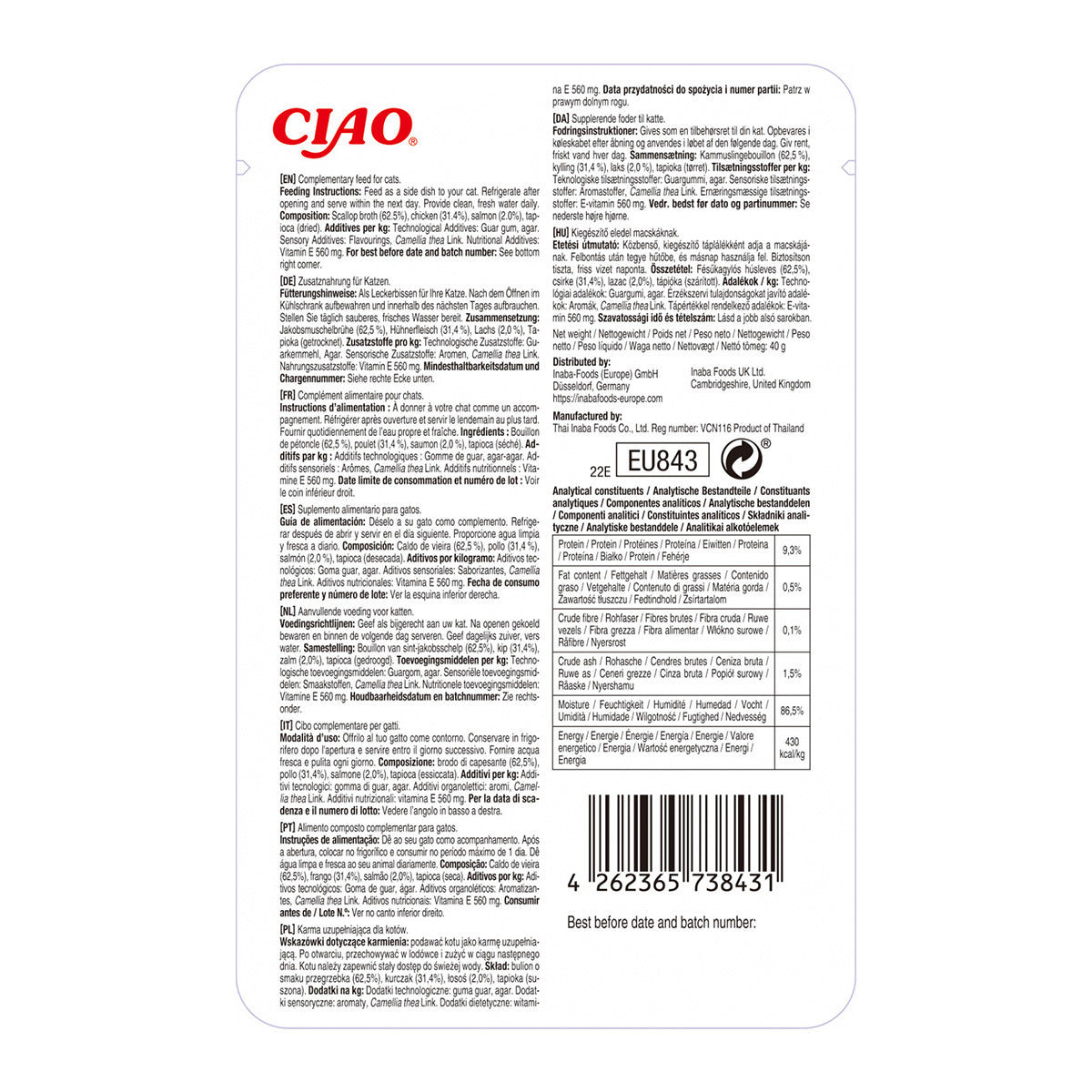 COMPOZITIE: supa de scoici (62,5%), pui (31,4%), somon (2,0%), tapioca (uscata). Aditivi la 1kg: Aditivi tehnologici: guma guar, agar. Aditivi senzoriali: Arome, Camellia thea Link. Aditivi nutritionali: vitamina E 560 mg