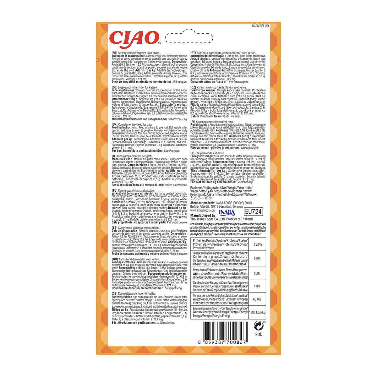 Pui, Apa, Ton, Tapioca, Albus de ou, Cazeinat de sodiu, Guma Guar, Aroma naturala de pui, Arome naturale, Extract de drojdie, Supliment de Vitamina E, Oleorasina de ardei (colorant), Extract de ceai verde.