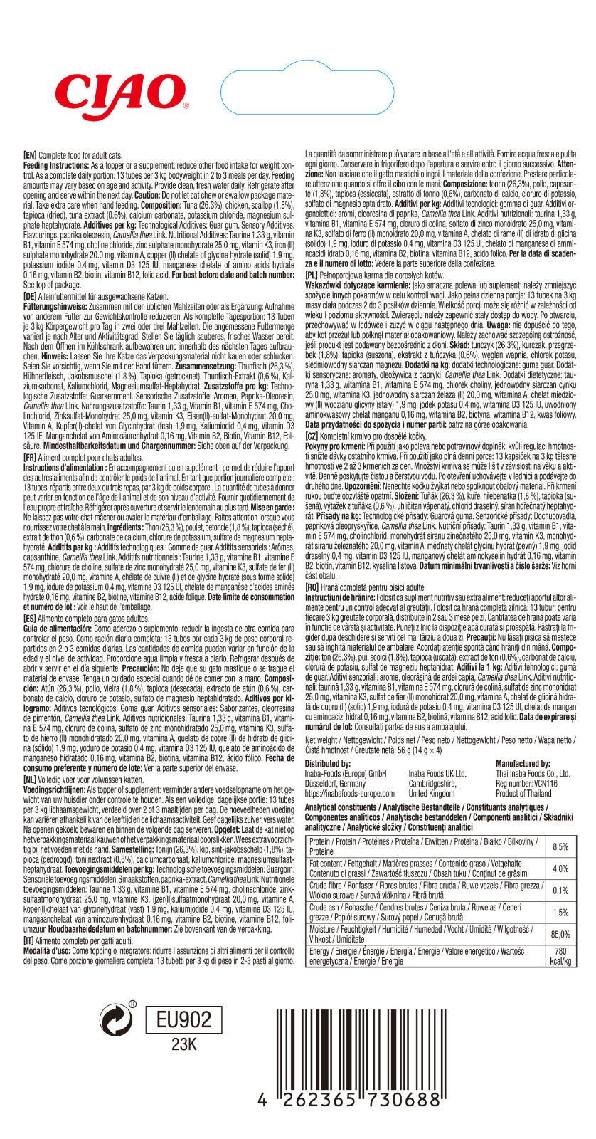 Componente analitice: Proteina bruta (min) 7,00%, Grasimi brute (min) 3,5%, Fibre brute (max) 0,50%, Umiditate (max) 85,00%, Vitamina E (min) 310 UI/kg, Taurina (min) 0,05%