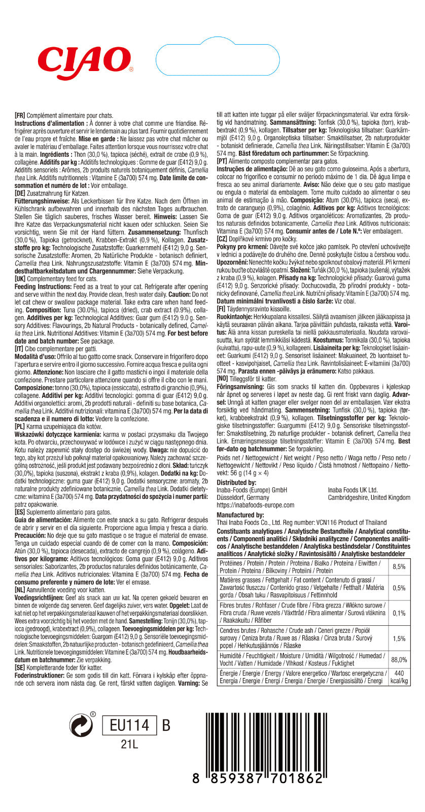 Importat de: Inaba-Foods (Europe) GmbH Düsseldorf, Germany +49 (0) 211-5407-0178 https://inabafoods-europe.com, Produs de: Thai Inaba Foods Co., Ltd. Reg number: VCN116 Product of Thailand.