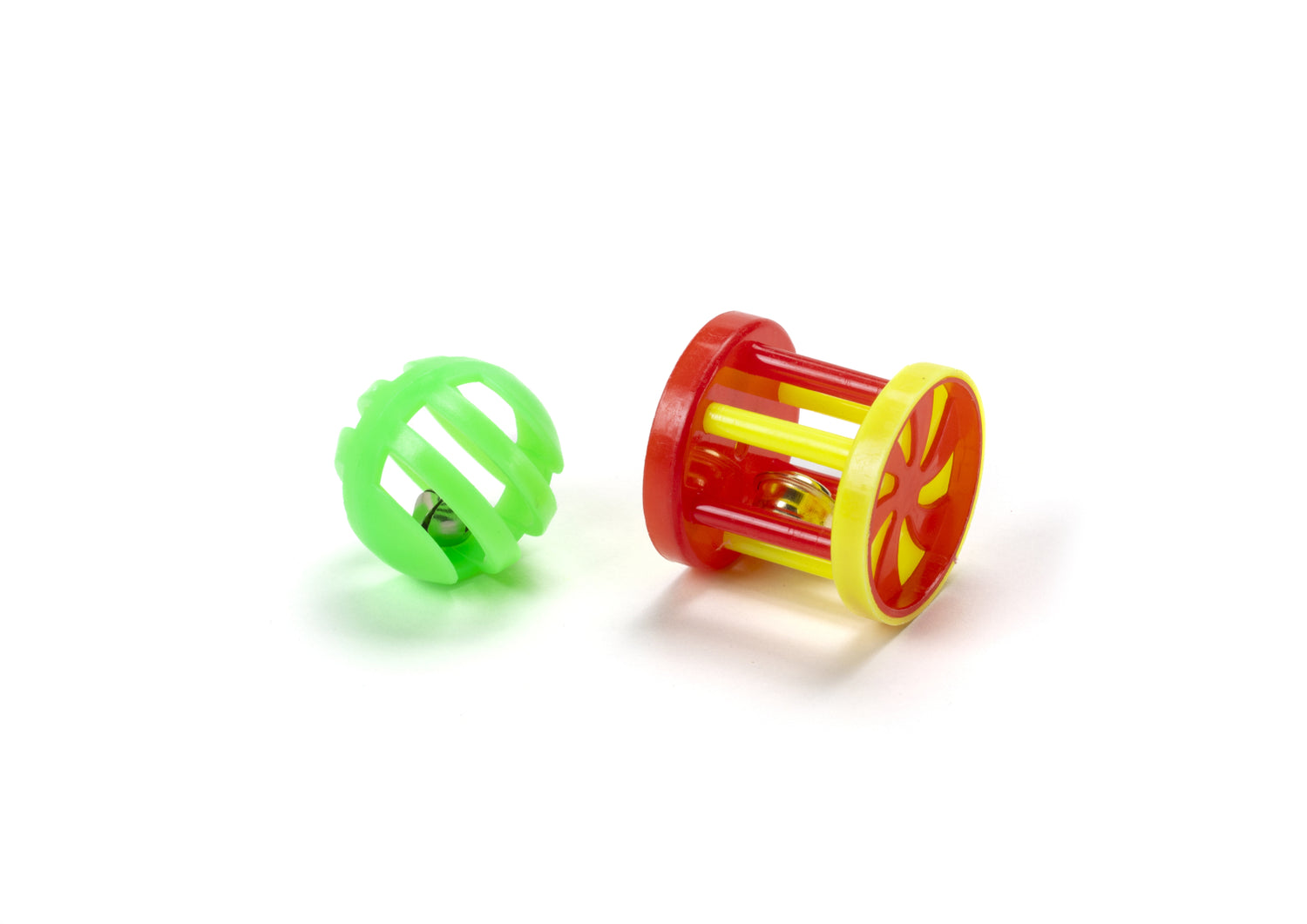 Acest set contine doua jucarii din plastic rezistent – un cilindru si o minge – fiecare prevazuta cu un clopotel pentru a stimula interesul si instinctul de joaca al pisicii. Dimensiunile reduse (3,5 x 3,5 cm) le fac ideale pentru rostogolire si prindere, incurajand miscarea si activitatea zilnica.