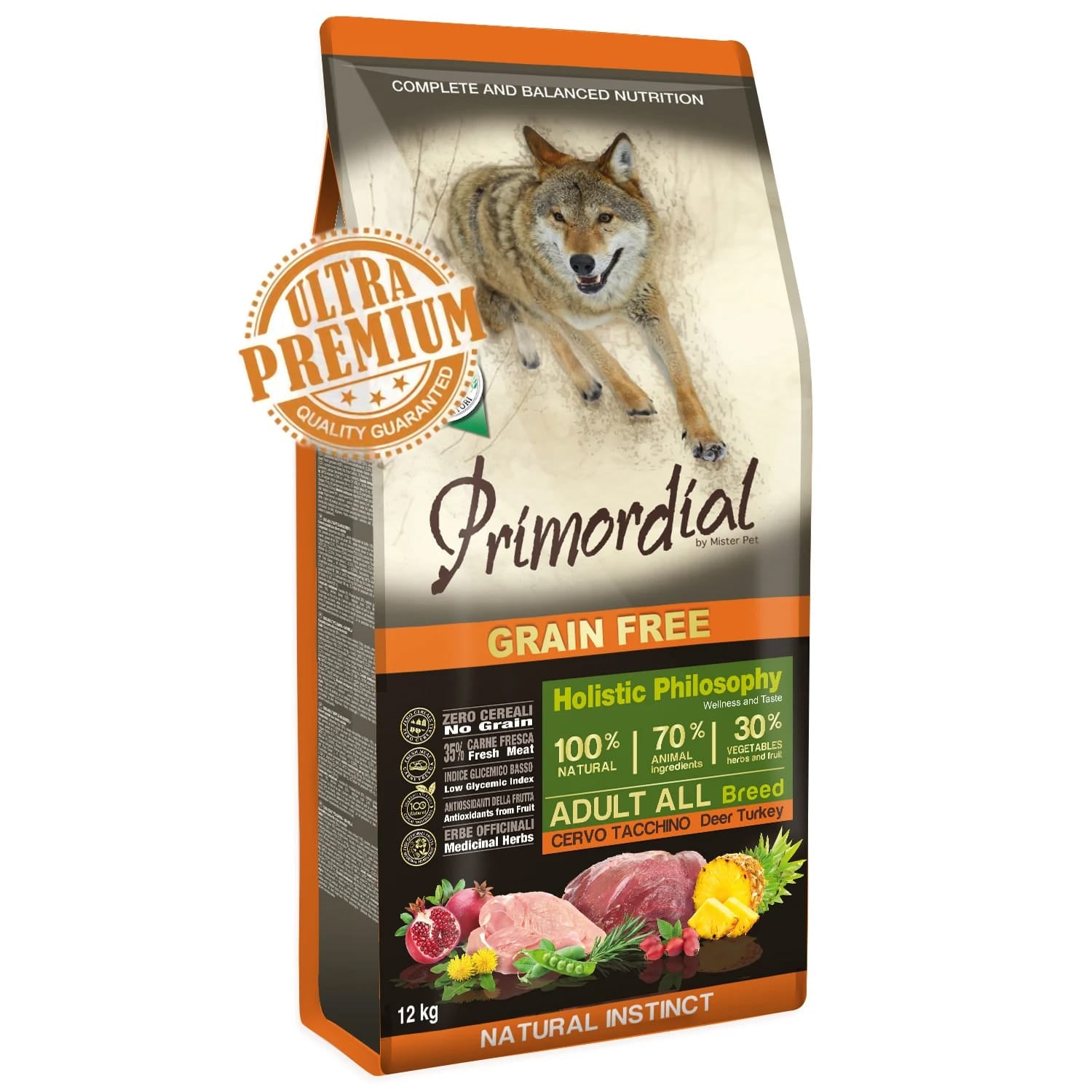 PRIMORDIAL Grain-Free HOLISTIC Dog Adult Caprioara si Curcan este alegerea ideala pentru cainii adulti care merita o alimentatie completa, naturala si echilibrata, ce sprijina digestia, imunitatea si vitalitatea zi de zi.